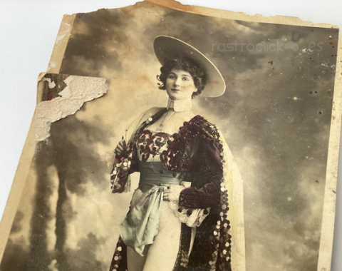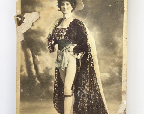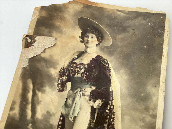 El vestuario que lleva (con capa brillante y pose teatral) coincide mucho con el estilo promocional de las vedettes parisinas entre 1905 y 1920.