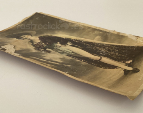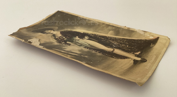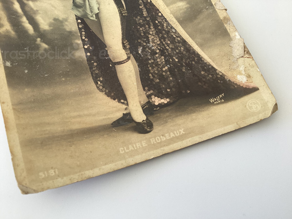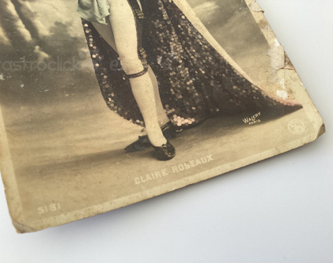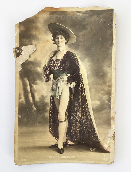 Representa a una intérprete de cabaret, teatro de variedades, opereta o music-hall parisino llamada Claire Roseaux. Este tipo de postales se producían para actrices y cantantes que actuaban en teatros como el Folies Bergère, Moulin Rouge o Olympia, y se vendían como recuerdo o material promocional.