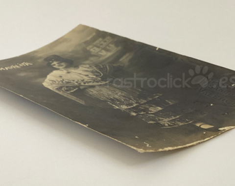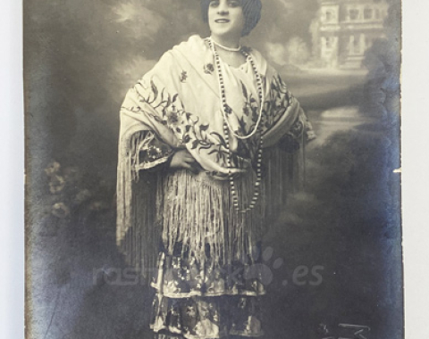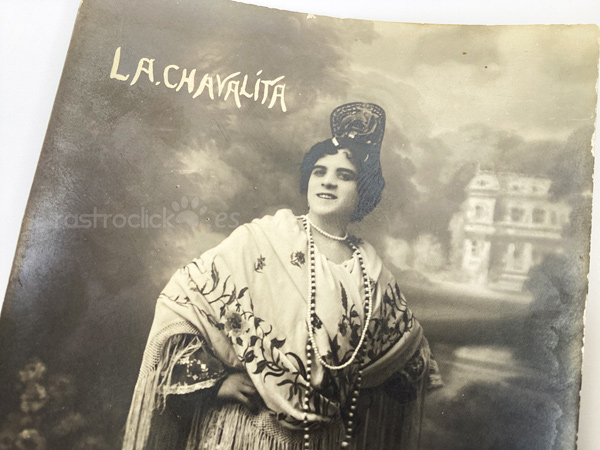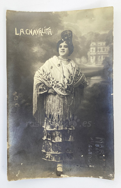Tarjeta postal de una artista apodada La Chavalita. Tarjeta postal de promoción de esta artista de entre 1905 a 1915. Por su vestimenta podría tratarse de una artista andaluza, flamenca, cupletista o bailaora. Fotografía realizada por el fotógrafo Marti, situado en la Calle Sangre 15 de Valencia.