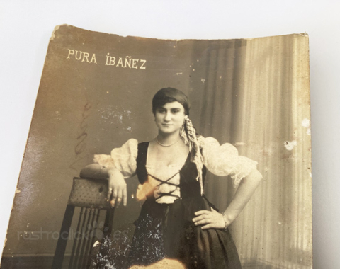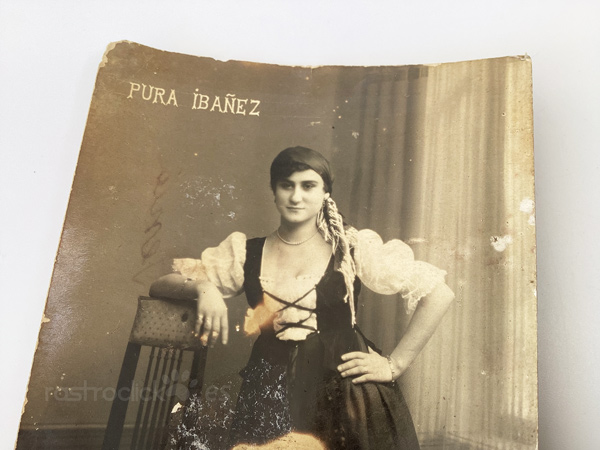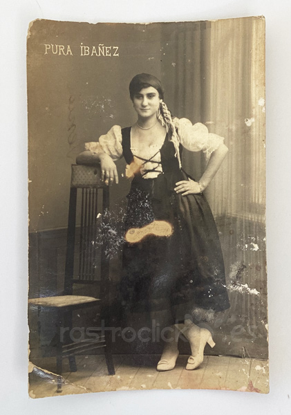 Tarjeta Postal de la artista Pura Ibañez. No se tiene ninguna información acerca de esta artista. La postal está escrita, la escribe una mujer indicándole, al señor que va destinada, el recio de contratar esta artista. Por lo que es una postal de promoción de la artista Pura Ibañez.