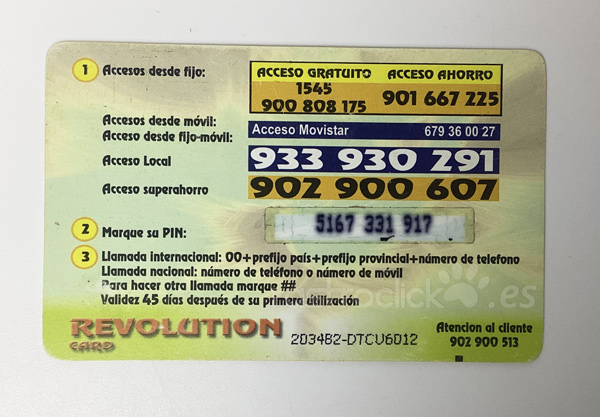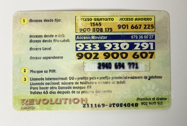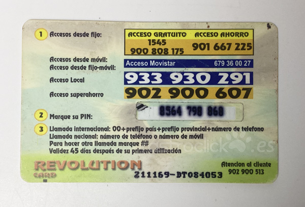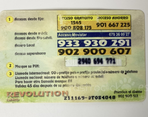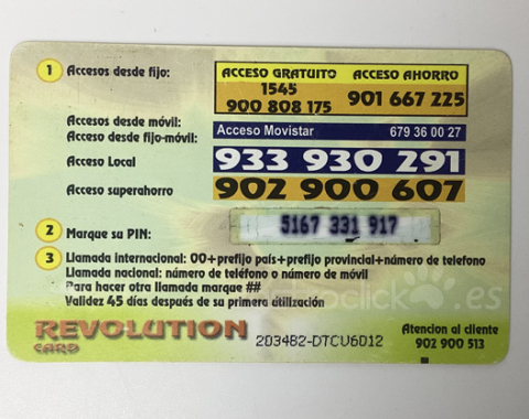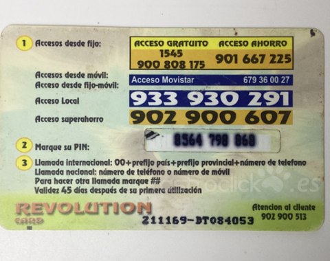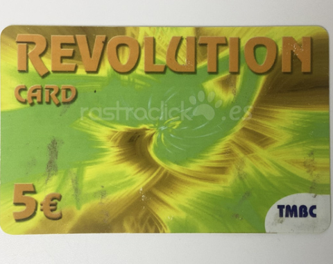 Tarjeta telefónica prepago REVOLUTION CARD TMBC. De plástico fino. Está usada. Contenía 5€ de saldo. Tengo 6 unidades, el precio es por unidad.