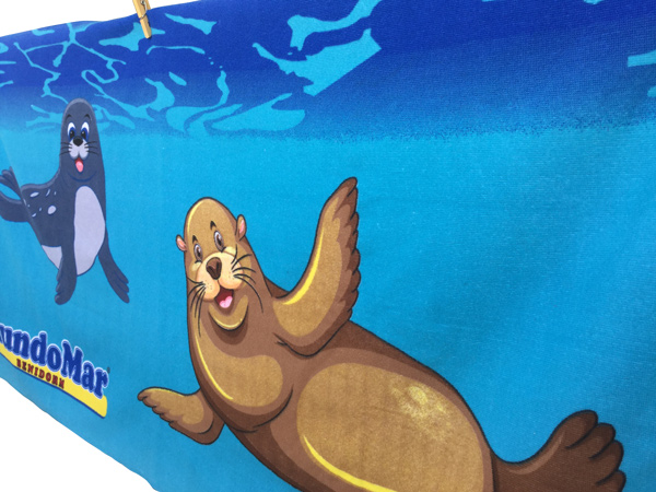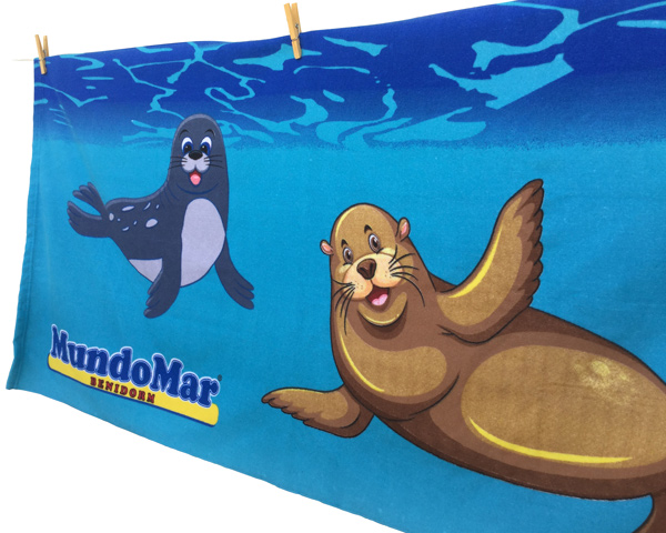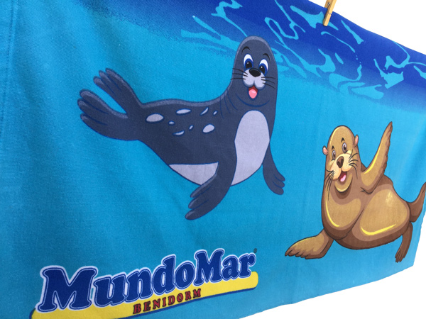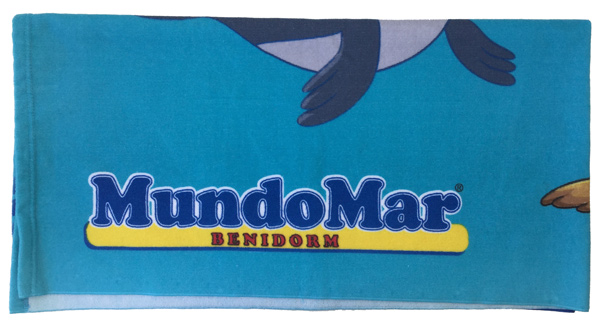 Toalla de publicidad Mundomar el parque de animales para niños de Benidorm. Fabricante: Promoprice. Material: 100% Poliéster. Medidas 135x71cm aproximadamente. Con tan sólo un uso, está como nueva.